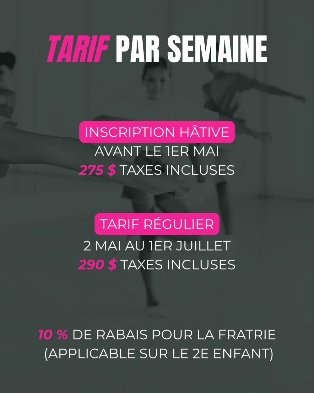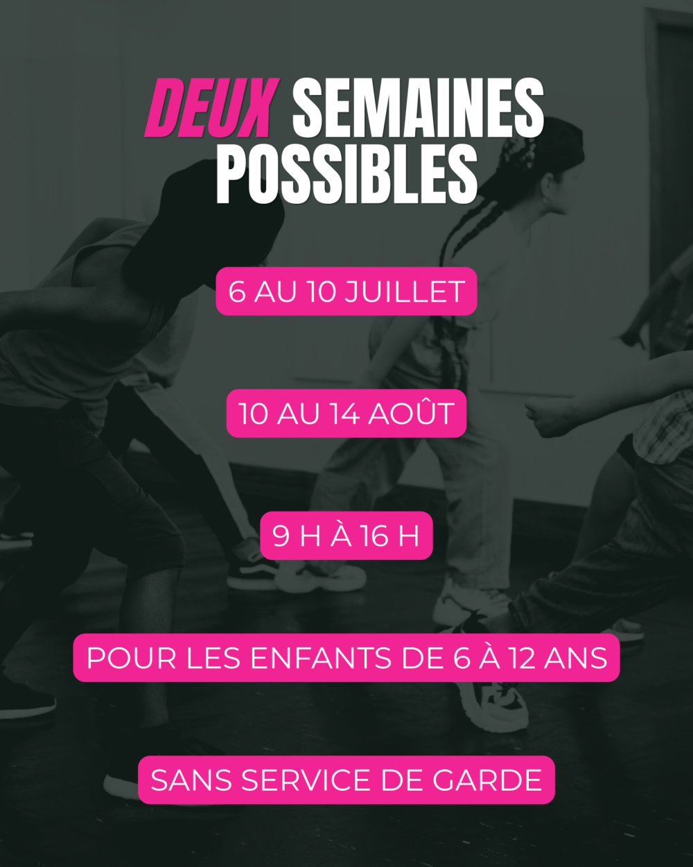 Une semaine entièrement dédiée à la danse, à la créativité et au plaisir, dans un environnement stimulant et rassembleur. Une expérience enrichissante pour un été inoubliable.