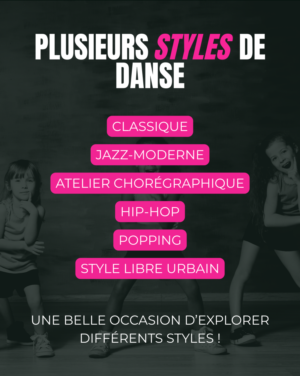 Tous les styles sont au rendez-vous : classique, jazz-moderne, chorégraphie, hip-hop, popping et style libre urbain.
